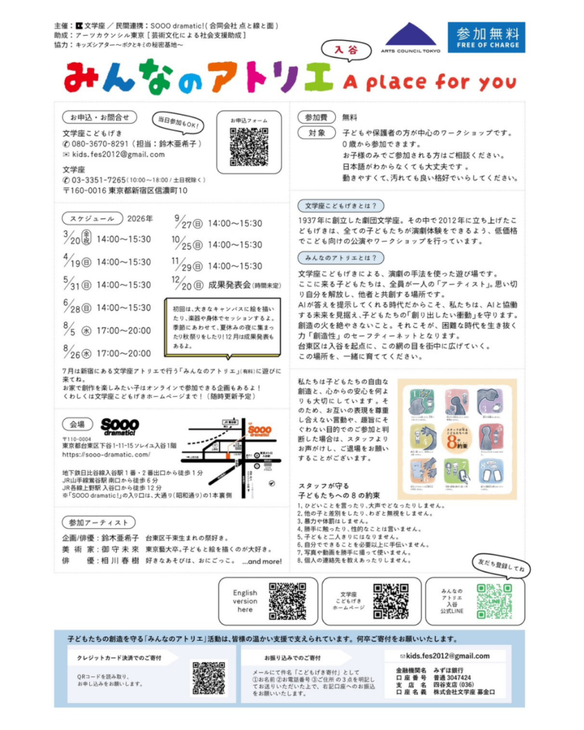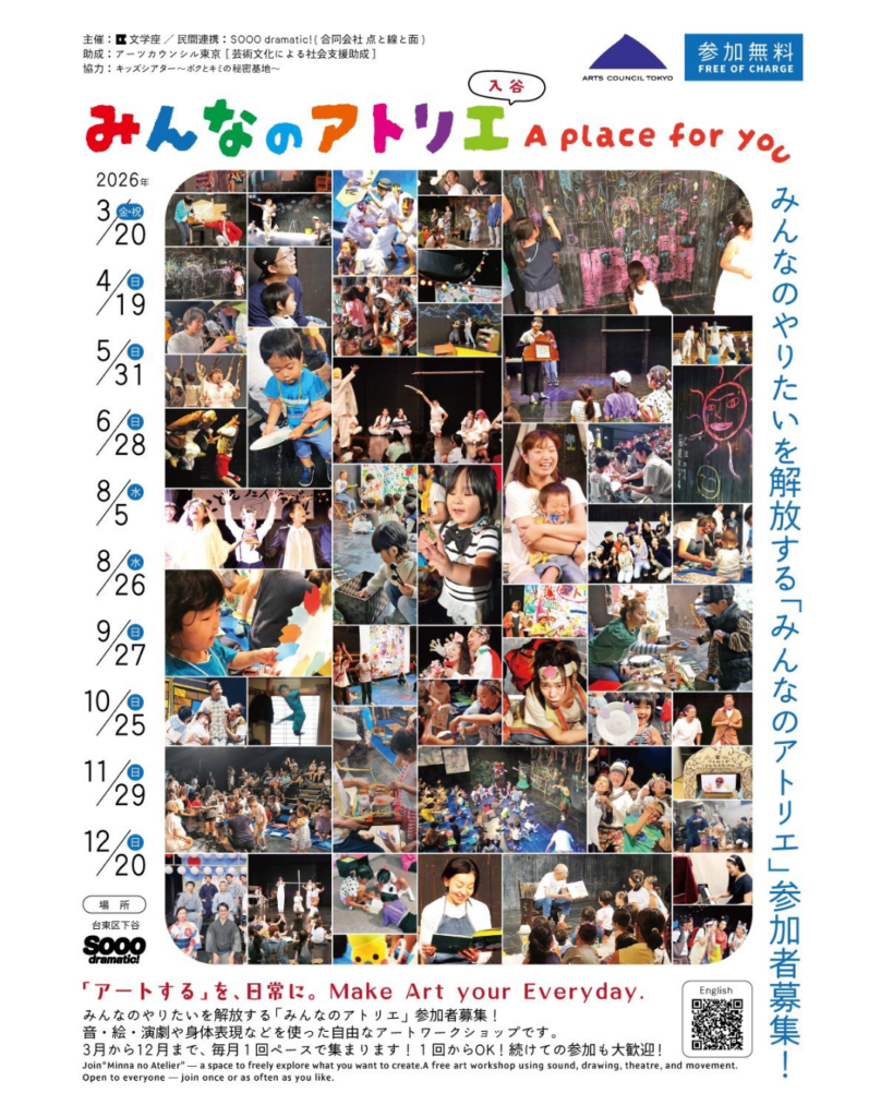 Join “Minna no Atelier” — a space to freely explore what you want to create. A free art workshop using sound, drawing, theatre, and movement. Open to everyone — join once or as often as you like.